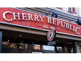 • Cherry Republic gift box containing 16oz original cherry salsa, 8oz dark chocolate covered cherries, 8oz Montmorency dried cherries, and 8.5oz cherry jam