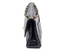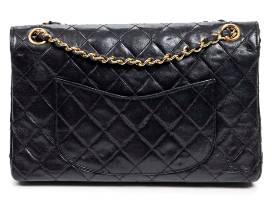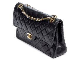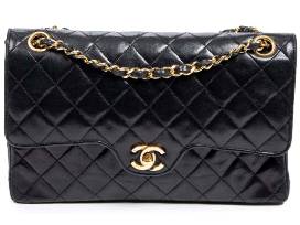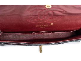 Material : Calf Leather - Type of Material : Quilted Lambskin Leather - Straps/Handles :Interlaced Chain with Black Leather - Hardware : Gold - Dimensions in cm : 25.5*16*7.5cm - Production code : 0115017 (1986-1988) - Condition : B = Very Good : Gently and often used, beautiful general condition, showing light usage signs thorough. - Accessories included : sticker