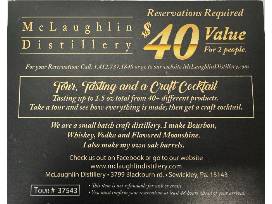 Take a tour of McLaughlin Distillery (Sewickley, PA) with 9 of your friends! Your tour will include tastings from 40+ different products, and a craft cocktail to end your experience. McLaughlins is a small batch craft distillery specializing in bourbons, whiskey, and naturally flavored moonshine. You'll be able to take home their signature Cream Bourbon and locally distilled Vodka!