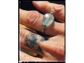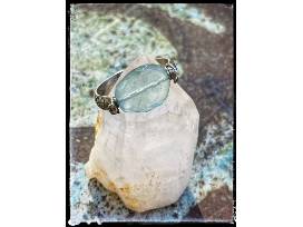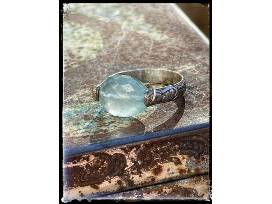 Faceted aquamarine gemstone set on floral pattern sterling silver U-shaped band.