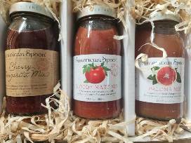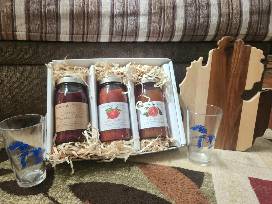 3 non-alcoholic drink mixes (Cherry Margarita, Bloody Mary, Paloma) from Michigan based American Spoon; 2 glass Great Lakes Tumblers, & Michigan shaped Bamboo cutting board.