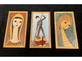 3 vintage Greek framed tiles signed by artist, E. Mixandidou 5.5"W x 9"H