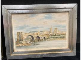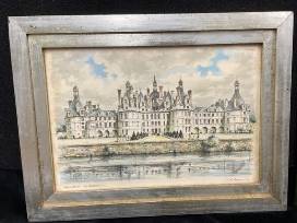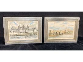Pair of framed watercolor pen and ink of Chambord and Avignon France signed 13" x 10"