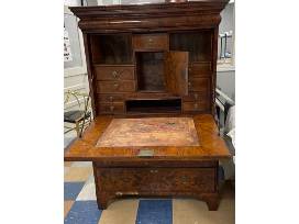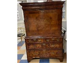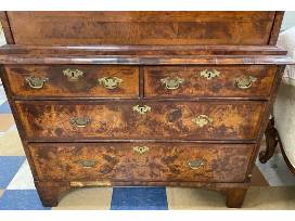 Queen Anne early 18th Century inlaid burl walnut secretary, desk or chest. Concealed cornice drawer and secret compartment. Similar desk online for purchase at $6,000