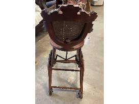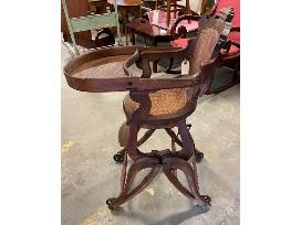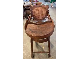 Antique oak Victorian convertible childs highchair rocker with oak shield back cane seat and back patent date 1899 36"H at back 14"W 20"D 23"H seat