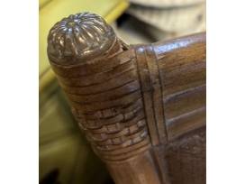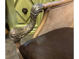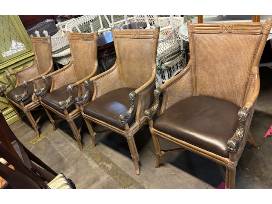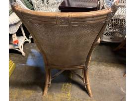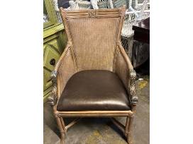 Set of 4 rattan Hooker dining arm chairs with leather seats and dolphin metal arms, 37.5"H x 25"D x 24"W