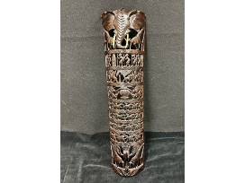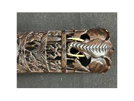 African carved wood wall hanging with tusks, 24" x 9" x 5.5"