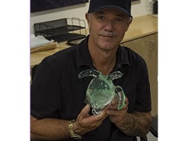 Wyland outdoes himself with this tender Lucite depiction of an ancient sea turtle swimming effortlessly through its underwater home. A splash of color adds a deeper dimension to this work of art that seems to change with the shifting light.