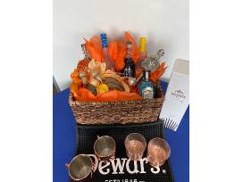 This Bar Basket provided by Southern Glazer Wine & Spirits has essential barware Items including a strainer, shaker, mule mugs, rocks glasses, juicer, bar mat and 9 top shelf bottles to start your next party and an Elijah Craig Golf Bag with essentials.