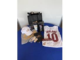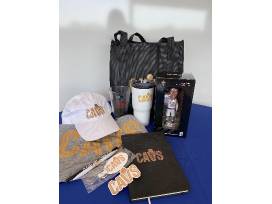 Cleveland Cavaliers Swag Bag | Cleveland Cavaliers branded T-shirt, baseball cap, Isaac Okoro Bobble Head, pint glass, thermos, notebook, pen, pencil, keychain, sticker, and tote bag.