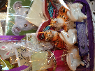 Basket filled with gifts including ceramic bunnies, tiger salt and pepper shakers, beautiful cards, votive candle holder, note paper and more! Thank you: My Secret Garden