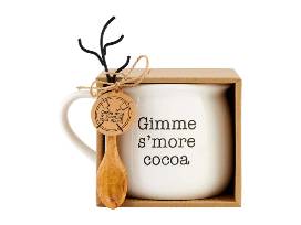 The two piece set comes with a large ceramic mug featuring the phrasing ""Gimme s'more Cocoa"". The set comes with wooden spoon that features a metal wire marshmallow handle that would be perfect for marshmallow roasting.