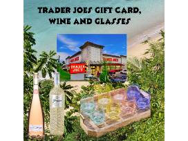 Trader Joes ($100 gift card), Colorful Stemless Wine Glasses (24 glass set), Bottle of Gerard Bertrand Cote des Roses & Freixenet Pinot Grigio