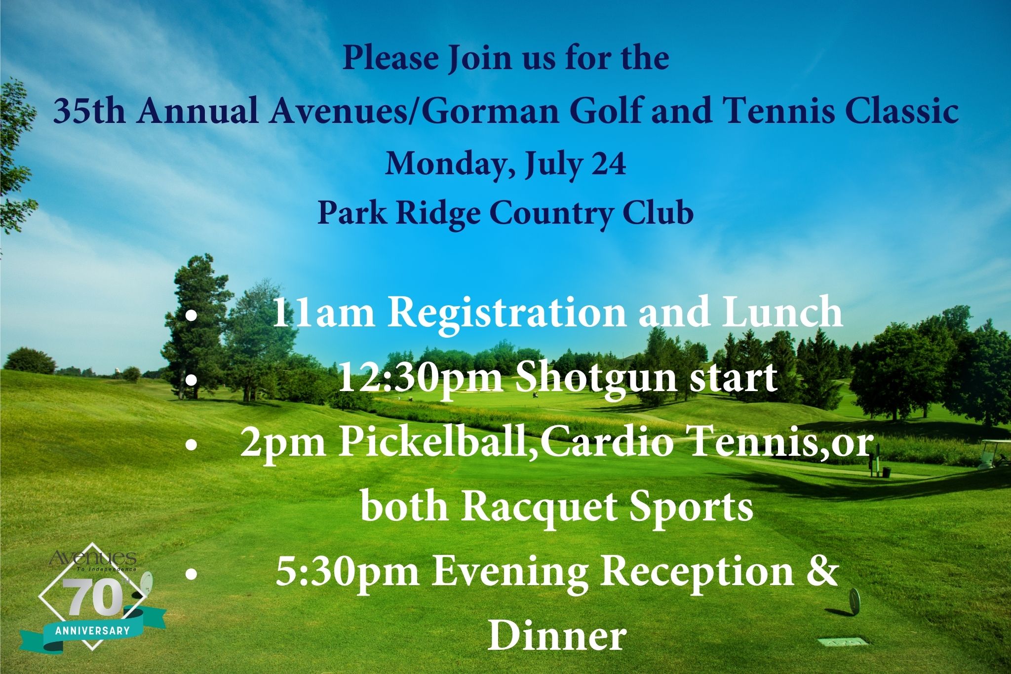 Please join us for the 35th Annual Avenues/Gorman Golf and Tennis Classic. This year will feature Golf, Tennis, Pickelball and an Evening Reception. Proceeds from the event will go to support important programming at our Center for Independence.