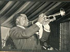 This photograph is one of Louis Armstrong improvising on stage. When Bob gave the jazz icon an 8"x10" photograph made from this negative, Mr. Armstrong said, "This is the best picture ever taken of me actually playing. All them other ones are of me holding the trumpet up to my lips."