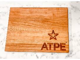 Custom ATPE Cutting Board: 9" x 12" cutting board made from cherry wood, featuring the ATPE logo. Includes food safe oil to preserve the beauty of the natural wood.