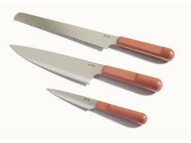 Our Place Knife Trio: Cover all your slicing needs with just three knives. This trio includes an everyday chef knife for sturdy chopping and all-the-time use, a serrated slicing knife for anything soft and squishy or hard and crusty, and a paring knife for those tinier tasks. Knife blades are made of stainless steel with hand grip in the color spice, to patch the cast iron pot.