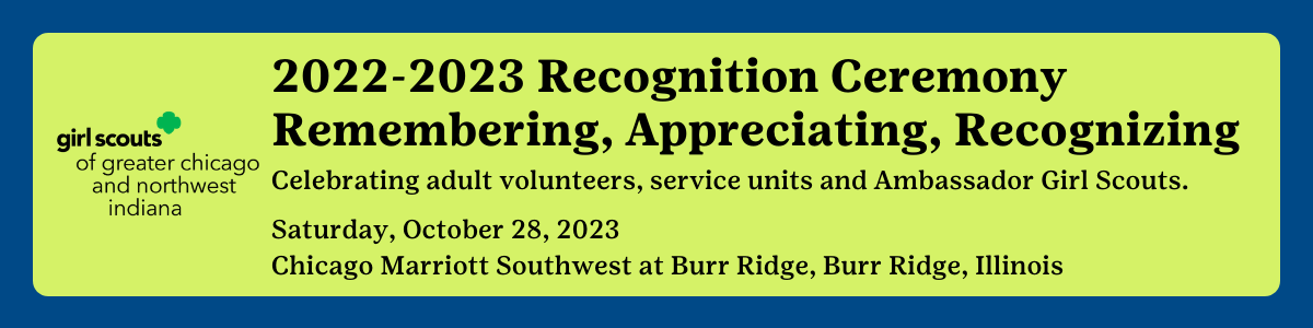 Awards to be presented include Formal Adult Recognitions (Appreciation, Honor, Thanks Badge I & II, Hall of Fame & DAISY), President's Award for Service Units, Adult Years of Service (2022-2023 Membership Year) and The Pinnacle Award for Ambassador Girl Scouts.