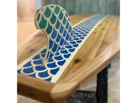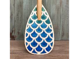 10? 1.5? wood paddle board built from knotty White Cedar woods, adorned with a center Aspen inlay, laser cut "mermaid" scales, poured with a gradient of blue-green epoxy.
