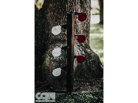 The PT Dueling Tree consists of a forward leaning center stand which allows gravity to do the work as the six reactive armor steel paddles swing from one side to the other when shot. Because the target is gravity reset and doesn't rely on springs or mechanisms, the PT Dueling Tree gives you reliable results every time. A deceptively simple design also makes it easy to assemble and disassemble. Each target paddle slides into two rings on the back of the stand that hold it securely in place but still allow for unrestricted movement and easy assembly and disassembly.