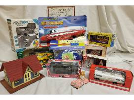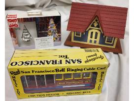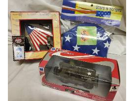 Wind Sock US Flag, Train Depot Miniature building, Vintage battery operated submarine toy, Chrystal Bell Hover Toy, City Cruiser Army Jeep, Busch Train Village Tree 7 yellow diodes, Bell Ringing Cable Car, F-11 Stars and Stripes Model Plane, Coca Cola Starliner Bus, Miss Piggy (Muppets) Die Cast Toy, Die Cast Metal Steelers Bank Truck Bank,