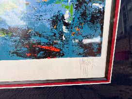 1Rare and highly sought-after original signed lithograph by Impressionist Mark King depicting a football game at Camp Randall Stadium. This stunning piece captures the excitement and energy of the game, with intricate abstract details and vivid colors that bring the scene to life. With its limited edition status and iconic subject matter, this lithograph is sure to be a prized addition to any collection of sports memorabilia.
