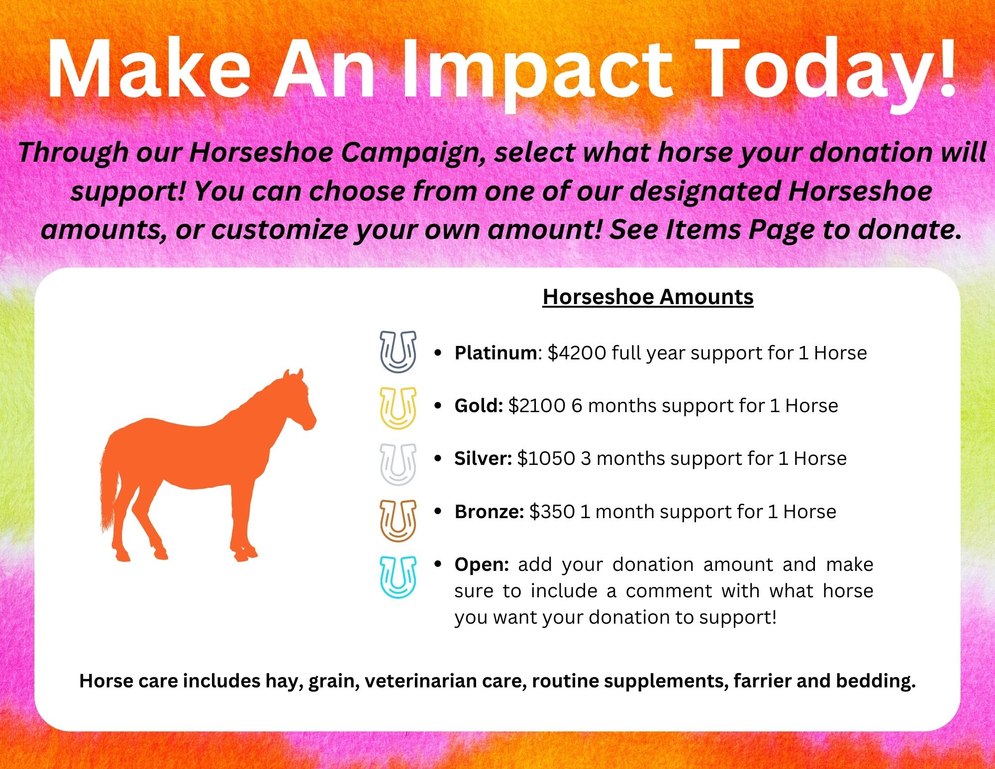 Check out the "Items" page or "View Horseshoes" button above and chose either 1) one of our pre-selected Horseshoe amounts, or 2) select the Open Donation option to donate any amount you choose. If you choose the Open Donation, be sure to include a comment with what horse or horses you want your donation to support!