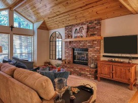 Inside, you will be greeted to an abundance of wonderful features including: diverse decor, fully equipped kitchen with necessary appliances, breakfast nook, and adjacent dining area. The spacious main living space features a beautiful brick crafted floor to ceiling gas fire place, vaulted ceilings adorned with knotty pine panels, trapezoid windows, plush chair and sectional sofa, and large screen Smart TV with popular streaming apps!