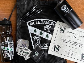This item also includes a travel tumbler, a water bottle, a cloth back pack, 2 credit card attachments for the back of your phone, 4 pens and some stickers, all with the Mt Lebanon Police logo.