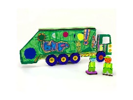 This package includes a certificate for one Art for Tots caregiver/child class for ages 2 - 4, plus everything a 4 year old or above needs to make a cardboard play Sanitation Truck at home.