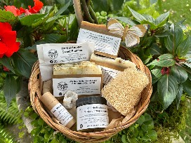 The beautiful Level Up and Ripple basket includes handmade herbal and medicinal tinctures including soap, lip balms, tea and mushroom products.
