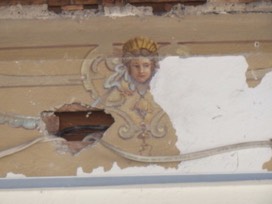 1Sponsor the Restoration of the Decorative Wall Art on One Wall in the former Dining Room of the History Center: Chief Conservator, Boris Brindar of A. J. Vater & Company uncovered decorative wall art on each wall in the former dining room in the History Center. In the center of each wall, along the ceiling, is this wonderful lady surrounded by painted scrollwork. Your donation will enable Boris to restore this lady and the rest of the decorative art to its former glory on one of the four walls in this room used for exhibits.