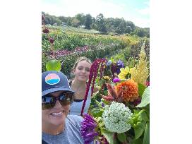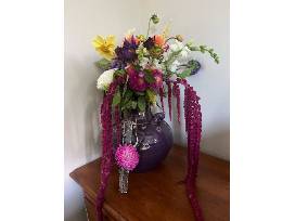 Large purple vase with floral arrangement PLUS five punch card for repeat fresh picked flowers at Cider Hill Farm this 2023 season and delicate wall or window vase by Pine Tree Glassworks in Dartmouth, MA.