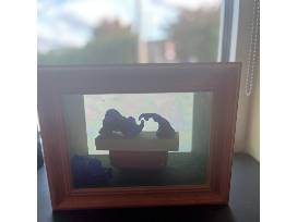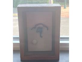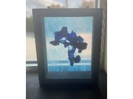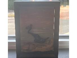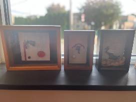 1Mixed-media shadow boxes, featuring melted glass and found objects.