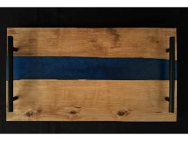 The combination of the live edge maple and the blue epoxy gives the illusion of a river running through a valley. Serving trays crafted by talented artisan Craig Yolitz are unique and truly one-of-a-kind. Each one is both functional and a work of art.
