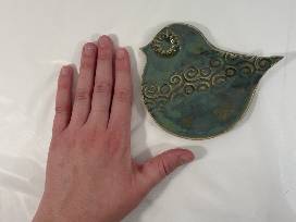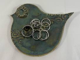 This small, bird-shaped tray is a stunning addition to any home. The size is ideal for holding rings, jewelry, end table items, and more. Hand thrown by a local potter, the textured finish and beautiful colors will stand out.