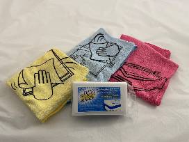 - 3 cleaning towels (pink, yellow, and blue)