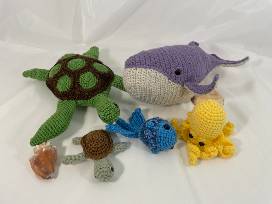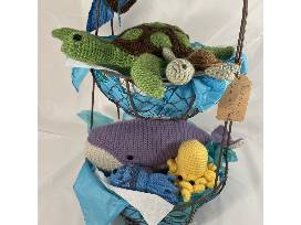 These cute little crocheted animals could be yours! This multi-purpose sea animal-themed basket could be used for everything from a baby shower to cat toys to fun collectibles! These cute little crocheted animals are ready to find a home. Basket includes: