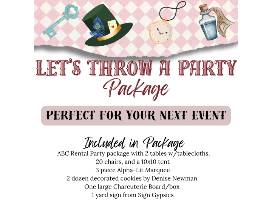 ABC Rental Party package with 2 tables w/tablecloths, 20 chairs, 10x10 tent, 3 piece Alpha-Lit Marquee, 2 dozen decorated cookies by Denise Newman, One large Charcuterie Board/box, 1 yard sign from Sign Gypsies