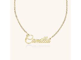 A personalized nameplate necklace from Monya Jewelry in stunning 10K solid yellow or white gold.