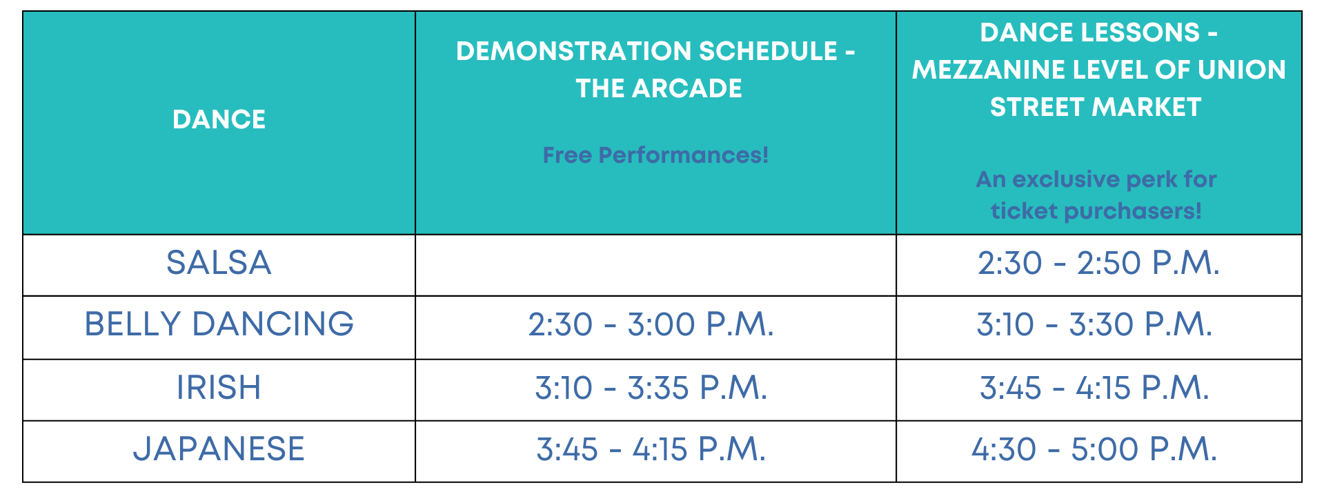 It's a worldwide trip in our own backyard! Join us at Union Street Market to support our local cultural food vendors and experience global dances in The Arcade from 2 to 5 p.m. Saturday, Sept. 16.