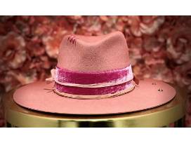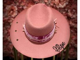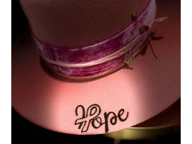 Custom one-of-a-kind brim hat by Alicia Jumonville. The hat features a wide brim adorned with metallic studs along one side. The crown is wrapped with a soft, velvet-like ribbon in a deeper shade of pink, giving it a luxurious texture. There are delicate embellishments, including a small metallic charm pinned to the side. The word "Hope" is torched on the brim.