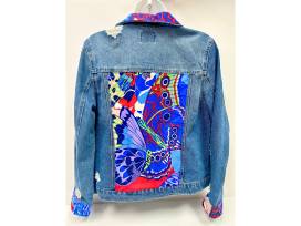 This Vintage Christian Dior Scarf Jean Jacket is a one of a kind garment that only you will own! A cool way to repurpose and wear a designer scarf! The cuffs, collar, and back are all designed to look super smart. Each unique piece is also crafted with a variety of trimmings.