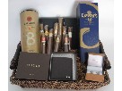 This basket contains a Gucci leather men's wallet, men's cufflinks, one (1) bottle of Bacardi rum and one (1) bottle of Dewar's blended Scotch whiskey along with a black leather travel humidor and cigars.