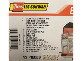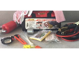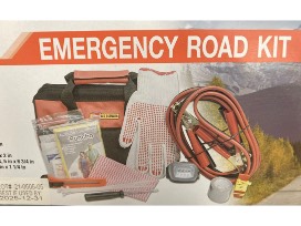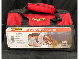 An Emergency Road Kit 52-piece set which includes a red and black bag, booster cables, headlamp, poncho, screwdriver, duct tape, cable ties, whistle, bandages, first aid supplies, first aid guide, and more! Every vehicle should be equipped with the essential emergency supplies recommended. This makes a wonderful gift for a loved one.