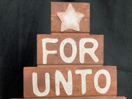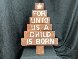 Wooden Christmas tree painted with "For Unto Us a Child is Born"