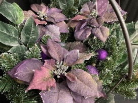 0A beautiful addition to your Christmas decor! Purple poinsettias with purple and silver ornaments.