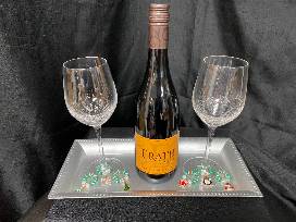 Includes 6 wine glass charms, set of wine glasses, bottle of wine and serving tray.