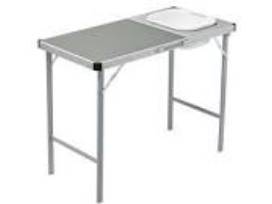 Camp table, portable, compact storage that's easy to assemble too, plastic basin for washing up needs, folding legs allow table to pack flat. Fridge stand is a back saver, keeps your cooler off the ground to save bending so far.