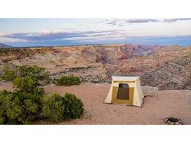 The package offers a perfect outdoor experience with the inclusion of a Barebones Teton Mesa Canvas Tent, coupled with a Barebones Cowboy Fire Pit Grill and essential cooking utensils.